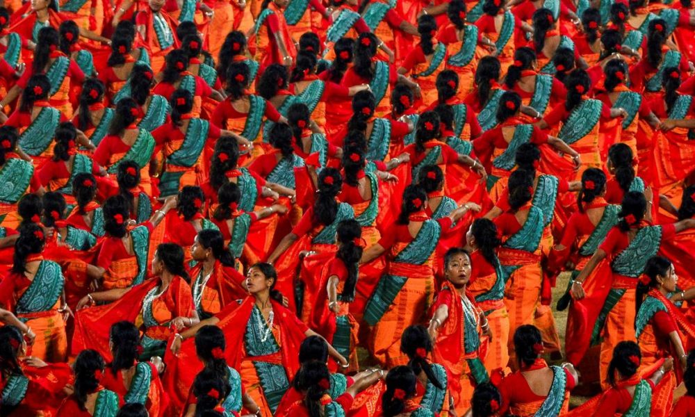 Bailarines Bagurumba de la comunidad Bodo hacen su presentación durante el espectáculo organizado en India para intentar romper un récord Guinness por la presentación de danza...