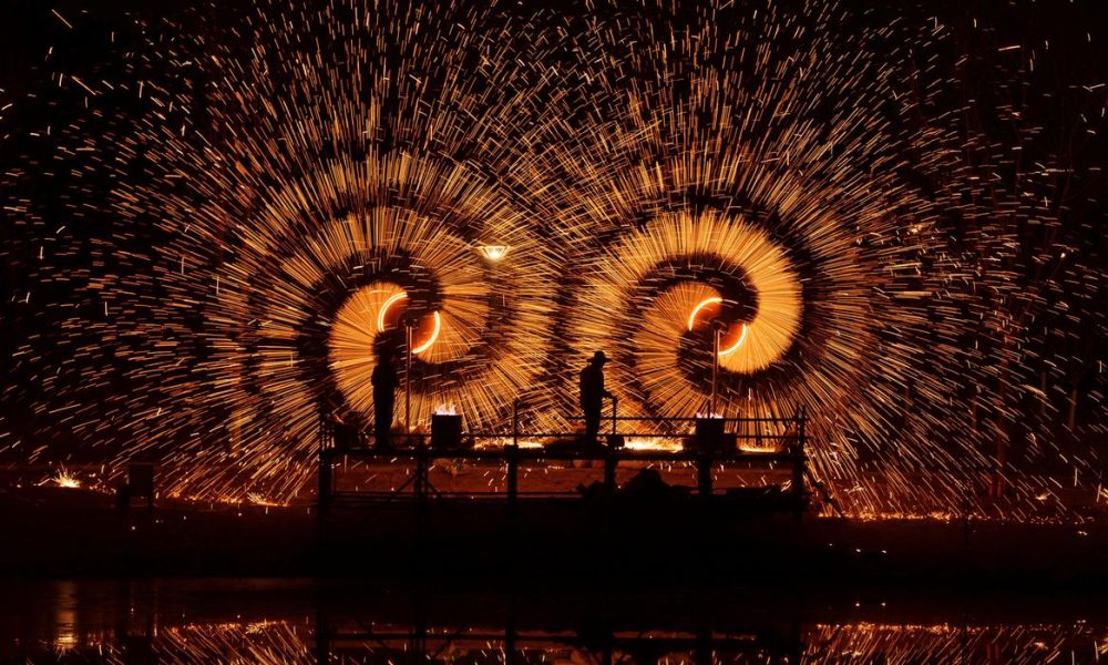 Fuegos artificiales de hierro fundido brillantes para el Año Nuevo chino. La tradición popular china conocida como da shuhua, o fuegos artificiales de hierro fundido, se...