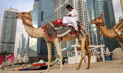 Un camellero revisa su teléfono mientras está sentado en su camello en la playa de Dubai el 10 de marzo de 2026. Los países del Golfo...