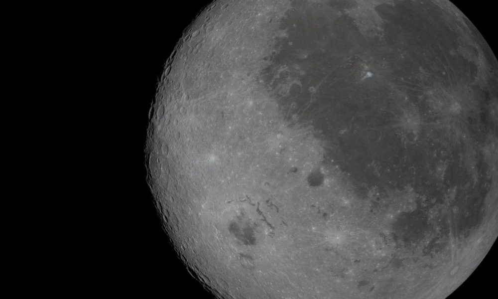 En esta vista de la Luna completamente iluminada, la cara visible (el hemisferio que vemos desde la Tierra) se aprecia a la derecha, identificable por las...
