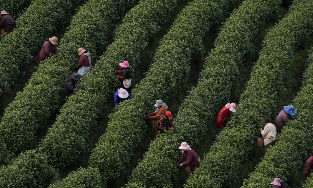 Esta foto, tomada el 8 de abril de 2026, muestra a trabajadores recogiendo hojas de té en un jardín de té en el condado de Anji,...