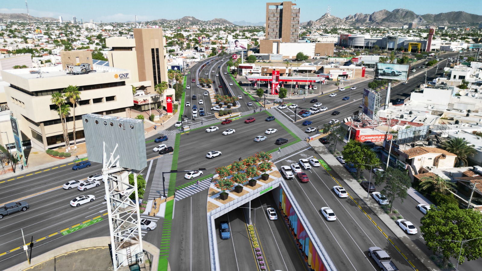- Incluye la modernización de 3 cruces semaforizados, en las intersecciones del bulevar Colosio con el bulevar Solidaridad y el cruce de esta misma rúa con las calles Real del Arco Norte y Real del Arco Sur, lo que incluirá la renovación de estructuras y luces, así como la colocación de semáforos peatonales.
