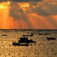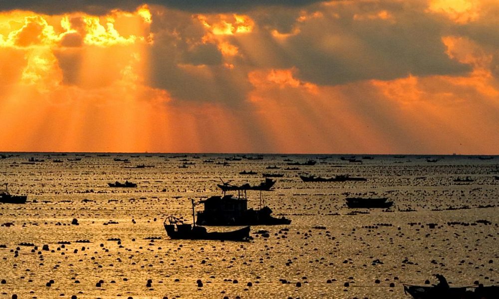 Bajo la dorada luz del amanecer, estos barcos de pescadores navegan en la zona de cría de abulones, en la bahía de Ailun, en Weihai, provincia...