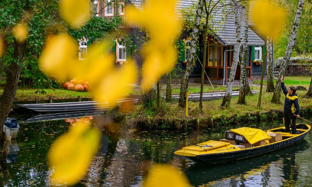 Andrea Bunar, cartera de Deutsche Post, recorre por última vez este año con su barca amarilla el bosque del Spree, en Alemania, para repartir cartas y...
