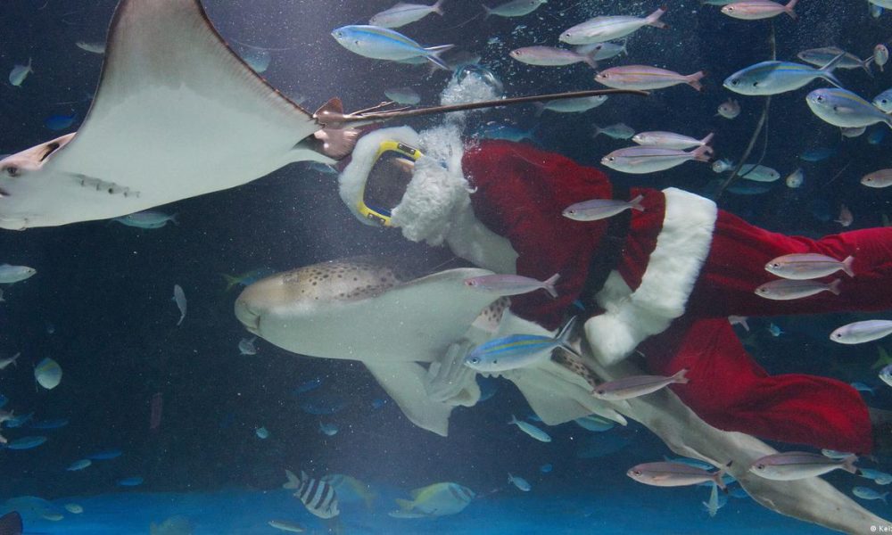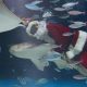 Un buzo disfrazado de Papá Noel nada con un tiburón cebra en el Acuario Sunshine durante los preparativos promocionales anuales para un próximo evento especial de...