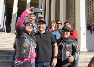 Hermosillo, Sonora, octubre 28 de 2023.- Desde la escalinata del Museo de la Universidad de Sonora, el Presidente Municipal Antonio Astiazarán Gutiérrez, dio el banderazo de salida a motociclistas que partieron hacia el evento de La Jauría dentro del Kino Fest, en el que se exhibirán alrededor de 300 motos.