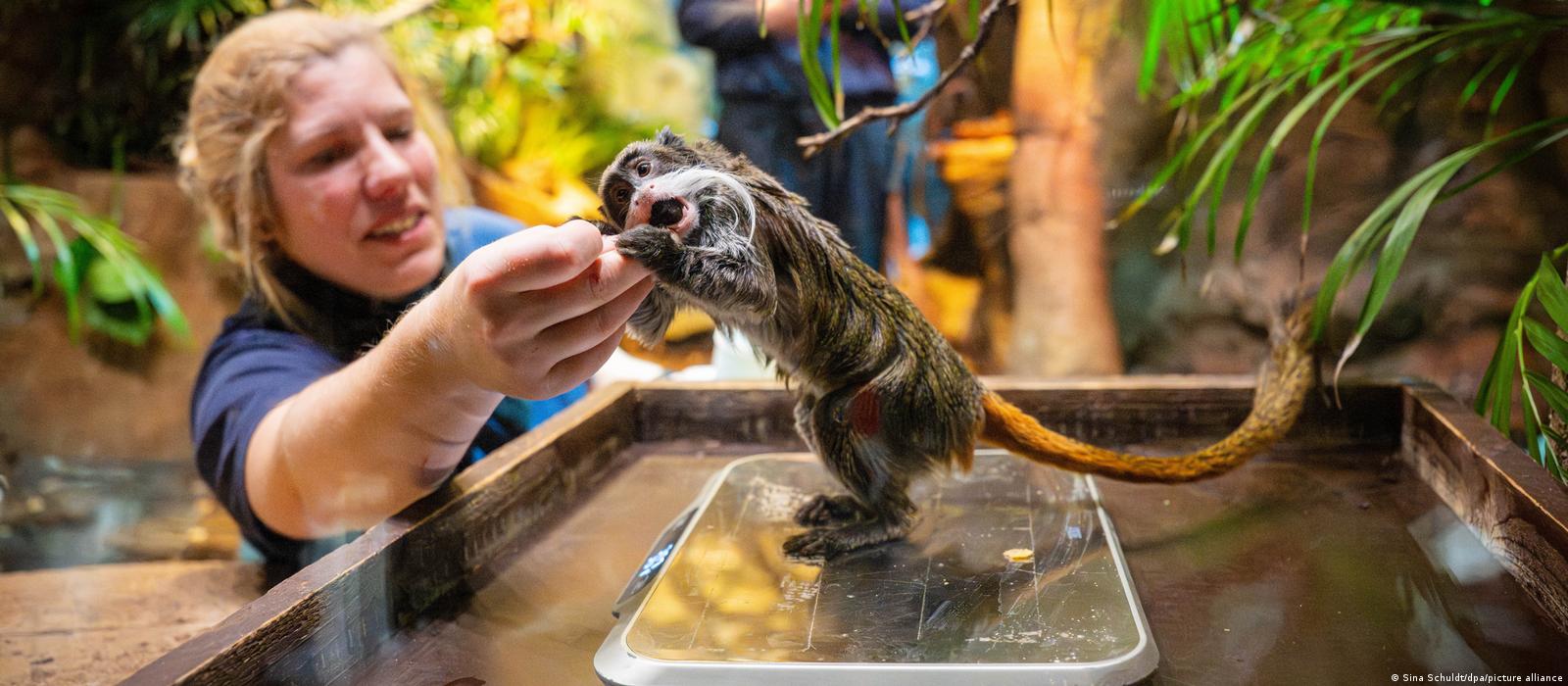 Todos los años, el Zoo am Meer de Bremerhaven, en Alemania, realiza un inventario de las especies que se encuentran en sus instalaciones. Una operaria acá cumple la tarea de pesar a un mono tití bigotudo para saber si mantiene su peso ideal. Se trata de un trabajo complicado, pero sin duda alguna, muy divertido (Especial).
