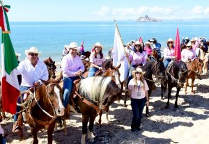 En compañía de alrededor se dos centenares de jinetes de varios lugares del estado y del municipio de Hermosillo, Toño Astiazarán recorrió una ruta con bellos paisajes por el pueblo de Bahía de Kino y su playa, durante el cual los habitantes del lugar disfrutaron del espectáculo al ver a los equinos desfilando.