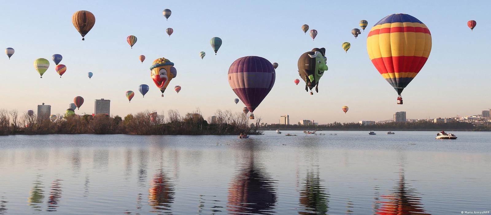 Más de doscientos globos aerostáticos, de las más diversas formas y colores, procedentes de más de 25 países participan este fin de semana en el Festival Internacional del Globo de León, en Guanajuato, México, así como dirigibles. En la imagen, muchos de ellos sobrevuelan el Parque Metropolitano de la ciudad. El programa incluye además espectáculos de luz y sonido, además de música en directo (AFP).