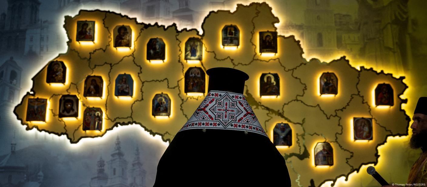 Un sacerdote ortodoxo observa un mapa de Ucrania, mientras bendice íconos pintados en placas blindadas que detuvieron proyectiles y salvaron vidas de militares ucranianos, durante la inauguración de la exposición ‘Altar de la Libertad’, en Kiev, mientras Ucrania sigue enfrentando el ataque de Rusia, desde febrero de 2022 (Reuters)