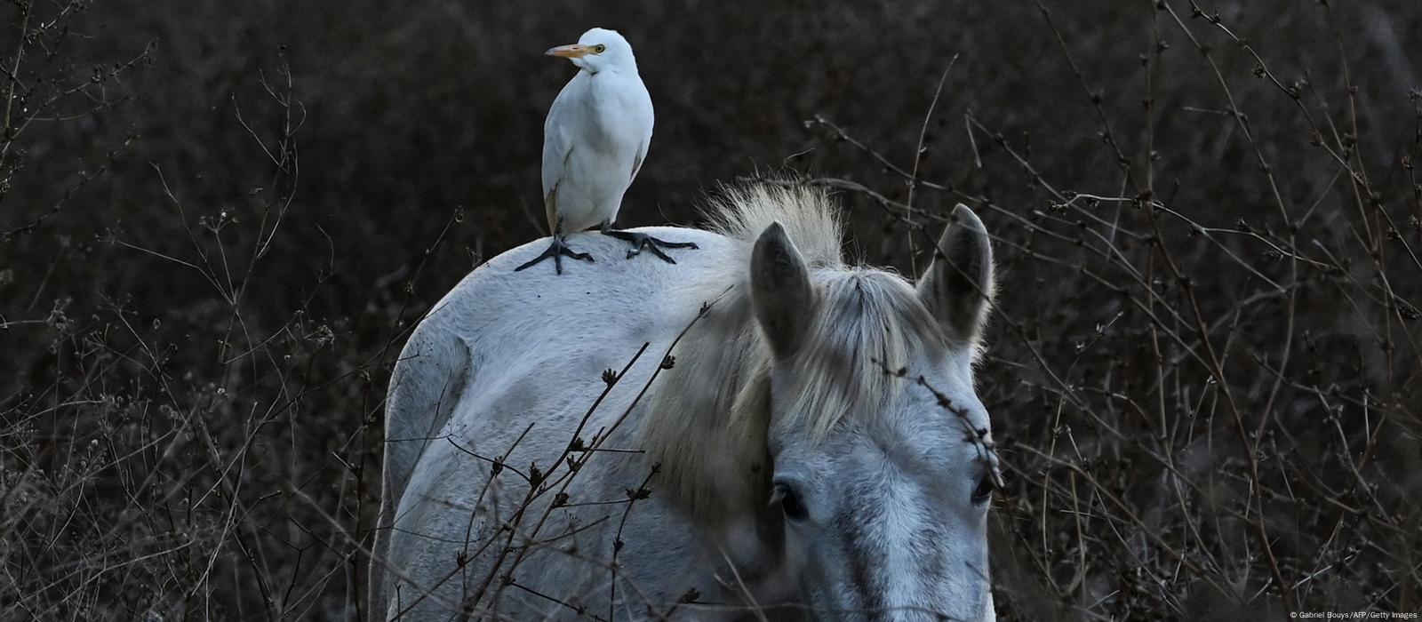 Una garceta se posa sobre el lomo de un caballo de Camarga, en un campo cerca de Villeneuve les Beziers, en el sur de Francia, y recuerda vagamente la icónica imagen del cuento infantil “Los músicos de Bremen” (AFP).