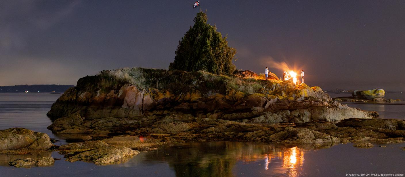 Una hoguera en Palmeira, Ribeira do Iguape, España. A esta pequeña isla hay que llegar en bote. La noche de San Xoán (San Juan), es una de las fiestas más antiguas y singulares del calendario gallego. Se caracteriza por el fuego, el agua, la gastronomía popular y las tradiciones transmitidas de generación en generación. En Galicia, las hogueras se conocen como “cacharelas” (Especial)